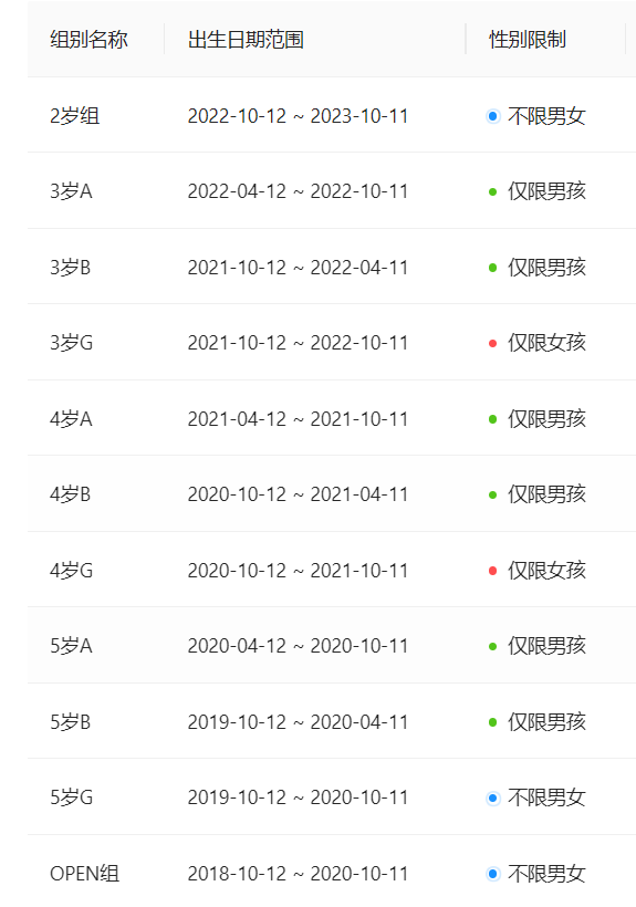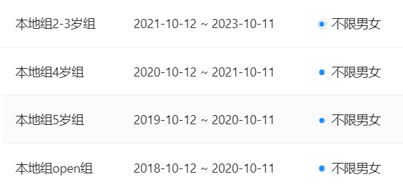 4、【赛事分组】2-3岁组、4岁组、5岁组、open组(整岁组别,不分男女)