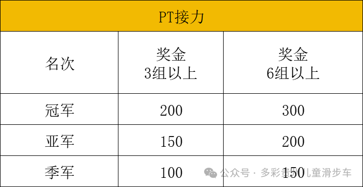 组队规则:双人接力赛成员2人组合年龄相加PT≦6,PT≦8,PT≦10,PT≦12;如有组别未满3组的将取消该组;(请自觉根据年龄报名组队)