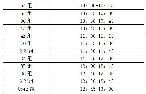 6、赛事组别:2岁组、3A组、3B组、3G组、4A组、4B组、4G组、5A组、5B组、5GA组、6岁组、OPEN组(5-10岁)共12个参赛组别。