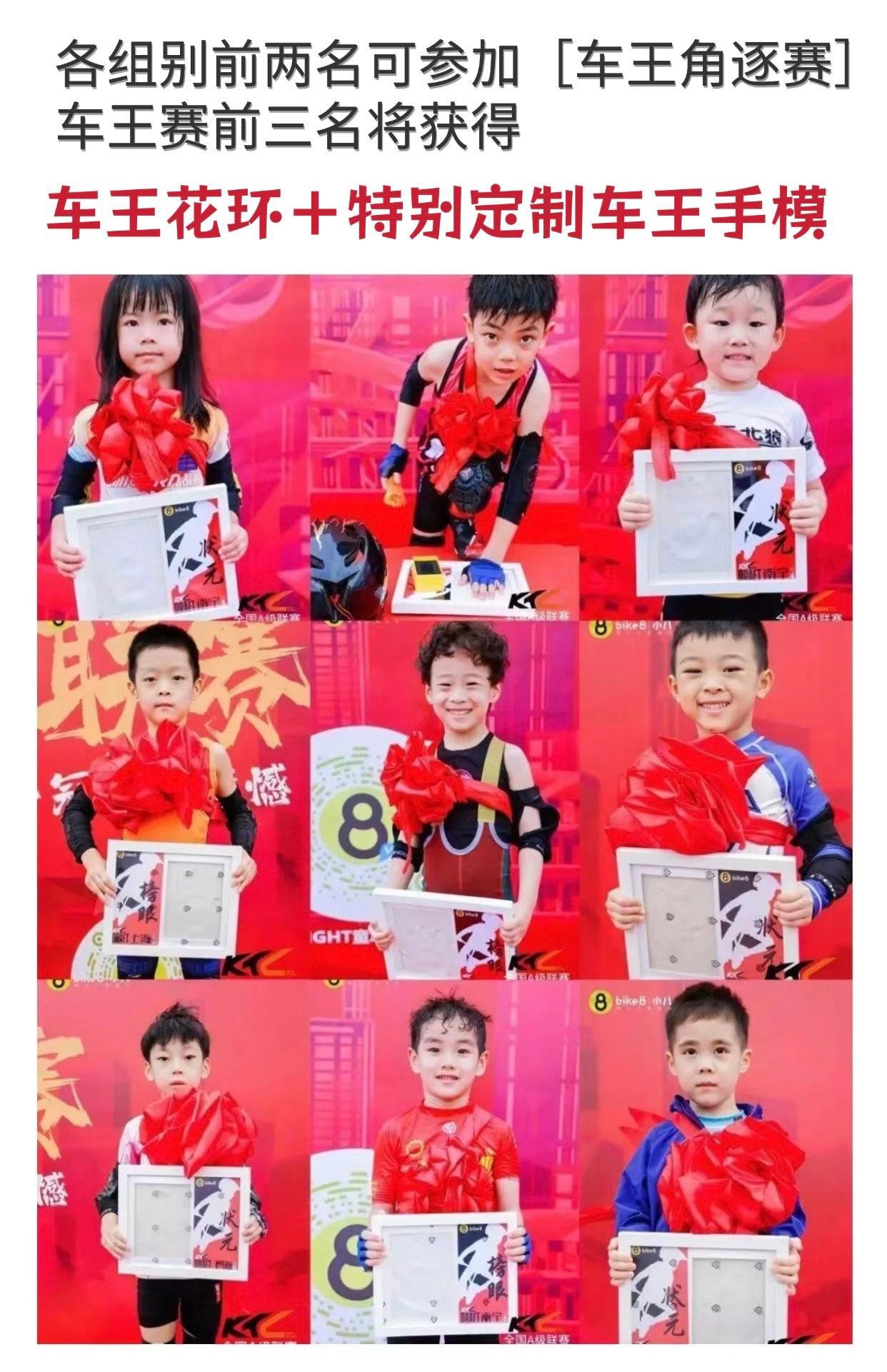 个人赛:全员奖杯,各组别前8名颁奖,将获得奖杯+积分(积分可累计兑换相应的奖品),各组别前两名可以跑车王赛角逐出x岁组车王