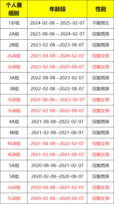 个人赛:2A组,2B组,2GA组,2GB组,3A组,3B组,3GA组,3GB组,4A组,4B组,4GA组,4GB组, 5A组,5B组,5GA组,5GB组,各组别无论几人报名均不开组。