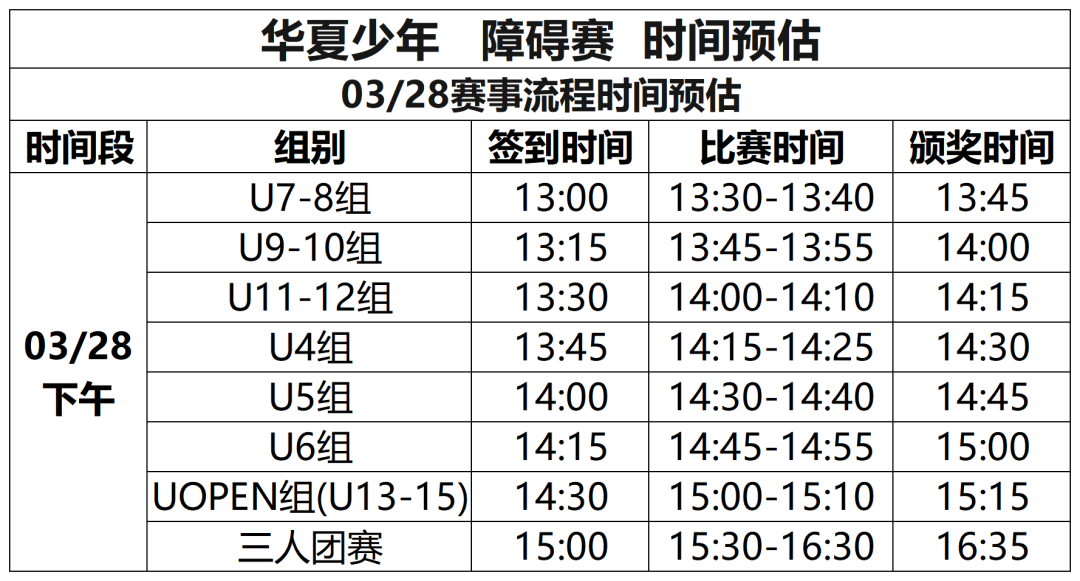 ●体能障碍赛:初赛按组别四人一组同时出发,各组别初赛选手按照完赛时间排名,取最快八名进决赛,决赛一轮,按完赛时间排名颁奖(如组别不满8人,跑两轮,以第二轮完赛时间排名颁奖)