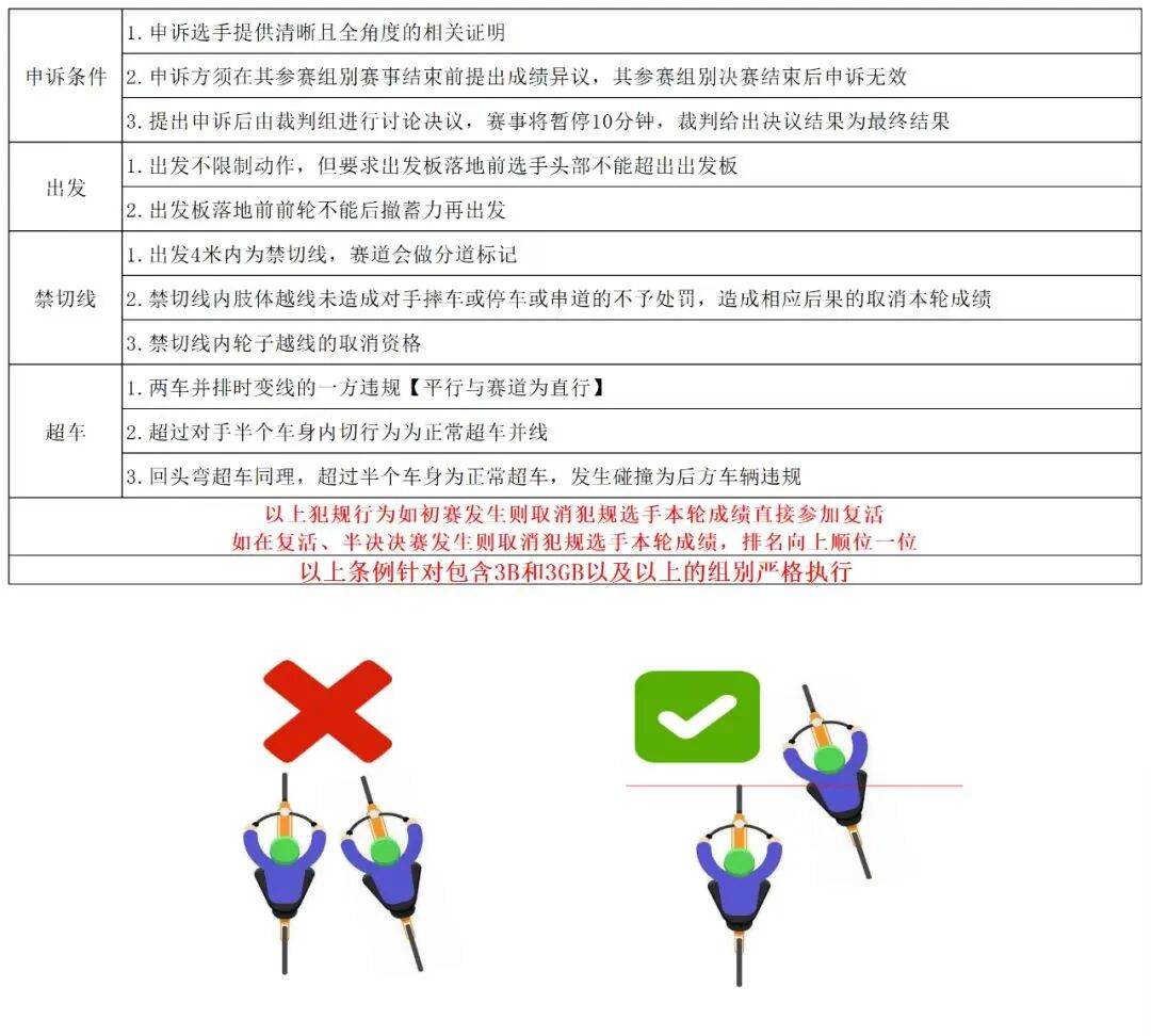 *如初赛回合出现犯规,初赛成绩取消,可再进行复活赛。如赛事中出现选手超线或压线时撞人行为,导致其他参赛选手摔倒,摔倒的选手成绩名次还以实际获得名次结果为准,无法调整,请知悉。