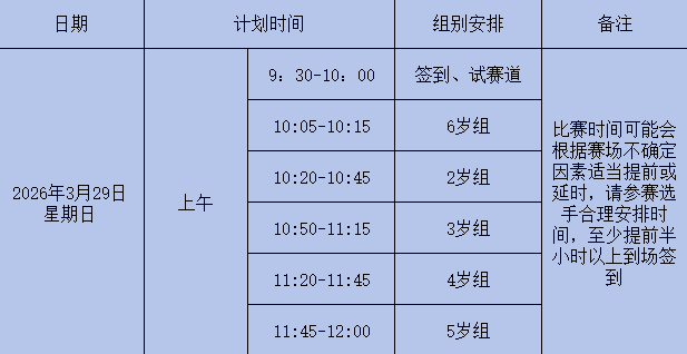1、时间:2026年3月29日当天9:30开始进行签到(组别开始比赛前15分钟停止签到)