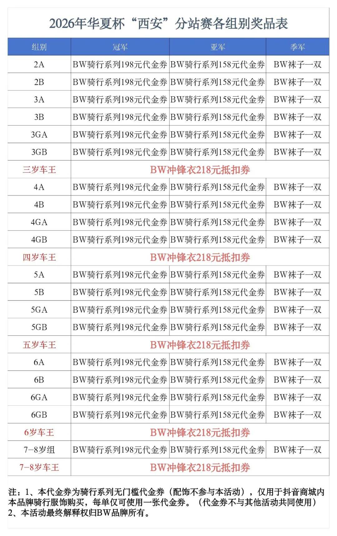 *2026年全新升级车王赛,各组别不分男女,即每年龄组冠亚季军晋级;