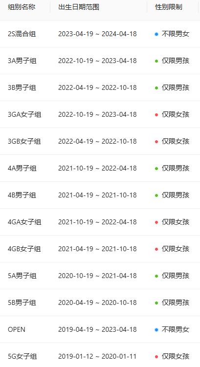 7.各年龄组以比赛日进行计算出生年月日,生日当天不升组(含周岁、半岁)。
