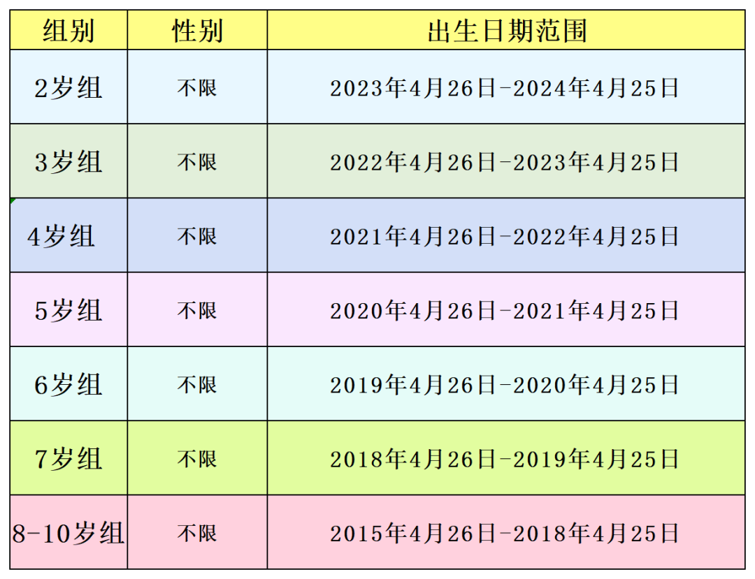 *请家长根据小朋友出生年月日报名相应年龄组。